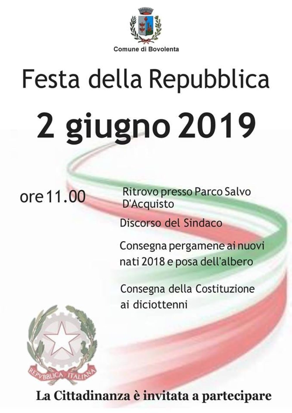 Il 2 Giugno 2019 si celebra la FESTA DELLA REPUBBLICA e anche quest’anno il Comune di Bovolenta organizza un ritrovo presso il Parco Salvo D’Acquisto in cui verranno consegnate le pergamene ai nuovi nati nel 2018 e copia della Costituzione ai diciottenni.