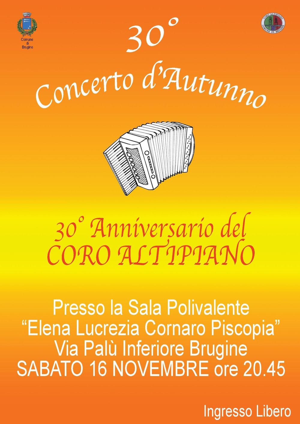 In occasione del 30° anniversario il Coro Altipiano Vi invita al Concerto d’Autunno sabato 16 Novembre presso la Sala Polivalente “E. L. Cornaro Piscopia” di via Palu inferiore a Brugine – ore 20,45.
