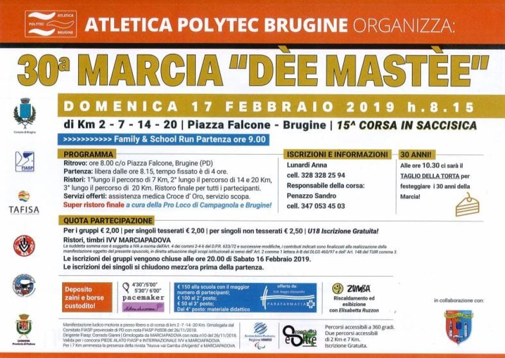 Domenica 17 Febbraio 2019 alle ore 8,15 in Piazza Falcone a Brugine si svolgerà la 30° “Marcia dee Mastee”, di Km 2-7-14 e 20. Iscrizioni entro mezz’ora prima della partenza.