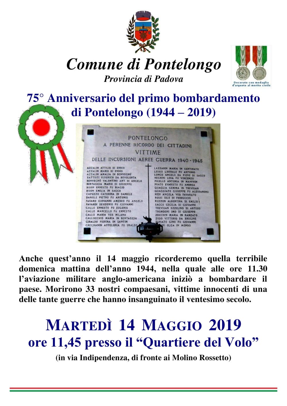 Anche quest’anno il 14 maggio ricorderemo quella terribile domenica mattina dell’anno 1944, nella quale alle ore 11.30 l’aviazione militare anglo-americana iniziò a bombardare il paese. Morirono 33 nostri compaesani, vittime innocenti di una delle tante guerre che hanno insanguinato il ventesimo secolo. MARTEDÌ 14 MAGGIO 2019 ore 11,45 presso il “Quartiere del Volo” (in via Indipendenza, di fronte ai Molino Rossetto)