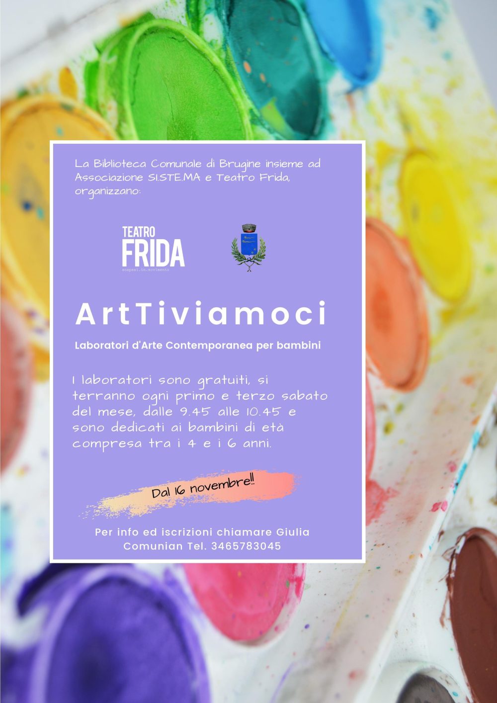 A partire da sabato 16 Novembre in Biblioteca Comunale a Brugine ricomincia il laboratorio gratuito di Arte con Giulia riservato ai bambini residenti dai 4 ai 6 anni, inizio ore 9,45.