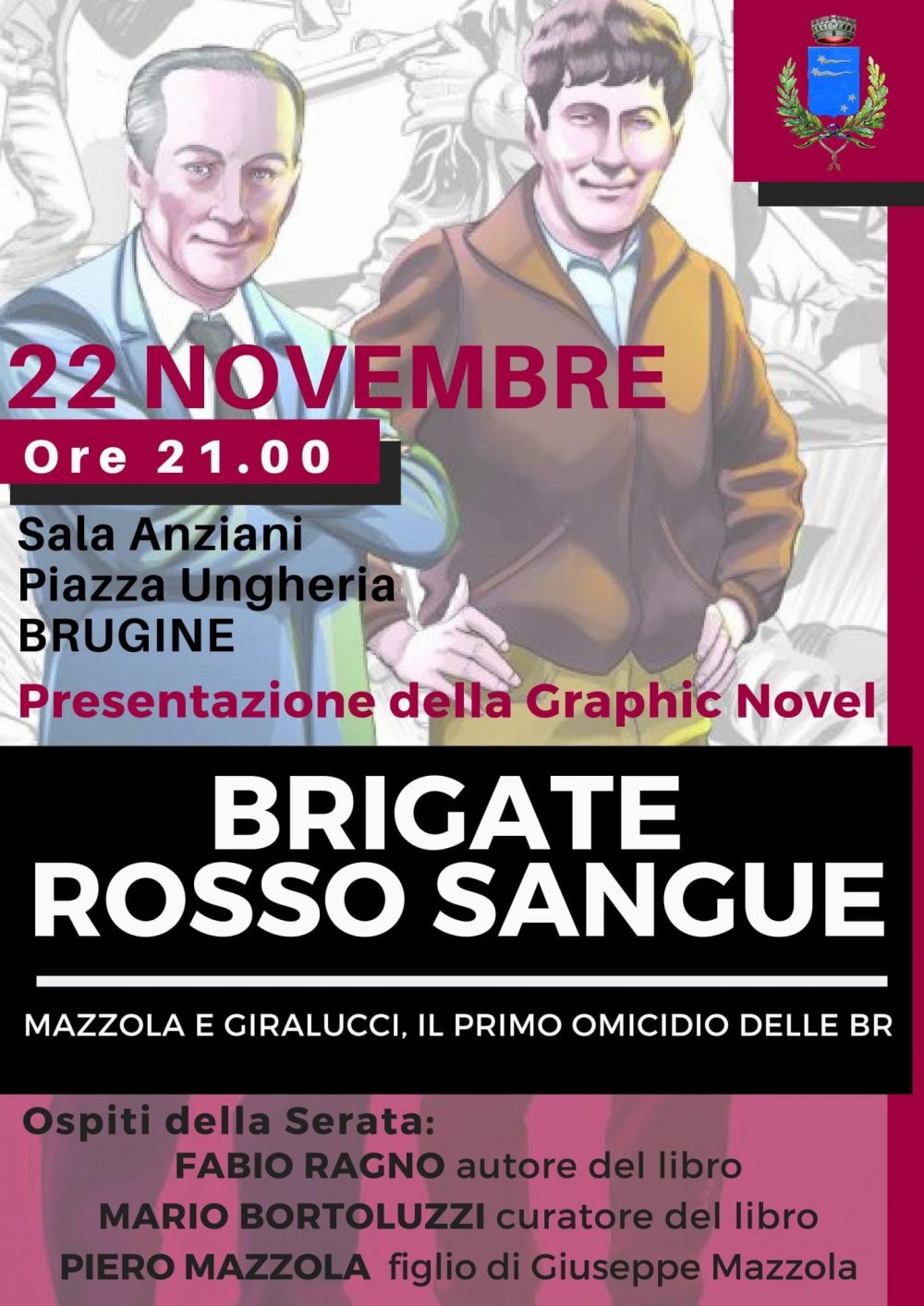 Venerdì 22 Novembre alle ore 21,00 presso il Centro Auser di Piazza Ungheria a Brugine presentazione della graphic novel “Brigate rosso sangue” di Fabio Ragno. Intervengono Mario Bortoluzzi e Piero Mazzola.