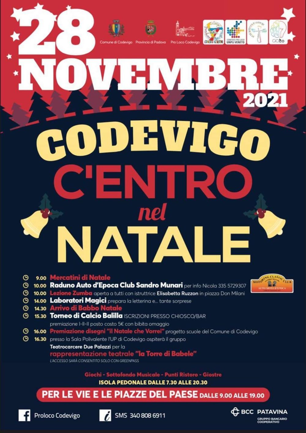 Il comune di Codevigo , in collabortazione con la Pro Loco di Codevigo propongono  C’entro nel Natale – 28 novembre 2021. Si inizia alle ore 9.00 con Mercatino di Natale, per continuare con zumba, raduno auto d’epoca, calcio balilla, laboratori per bambini, punti ristoro, giostre e molto altro!!!