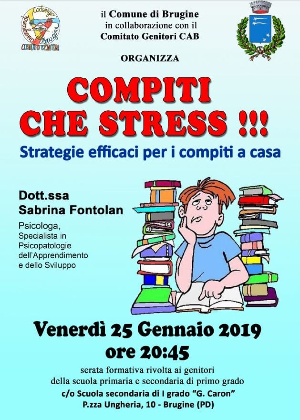 Venerdì 25 Gennaio alle ore 20,45 presso la Scuola “G. Caron” sita in Piazza Ungheria 10, il Comune di Brugine in collaborazione con il Comitato Genitori CAB organizza un incontro su strategie efficaci per i compiti a casa, tenuto dalla Dott.ssa Sabrina Fontolan.