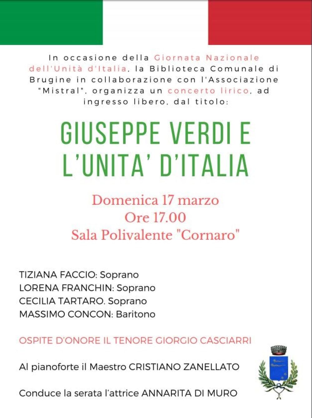 In occasione della Giornata Nazionale dell’Unità d’Italia Domenica 17 Marzo alle ore 17 presso la sala Polivalente “E.L. Cornaro” di Via Palù Inferiore concerto lirico intitolato “Giuseppe Verdi e l’Unità d’Italia.
