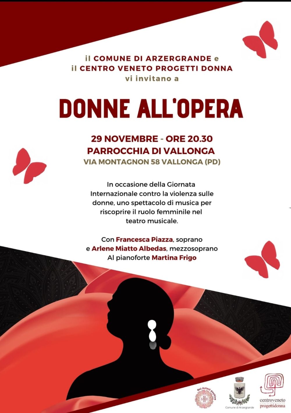 Venerdì 29 novembre, alle ore 20,30, presso la Parrocchia di Vallonga in via Montagnon 58, il Comune di Arzergrande in collaborazione con il Centro Veneto Progetti Donna, propone uno spettacolo di musica per riscoprire il ruolo femminile nel teatro musicale, in occasione della Giornata Internazionale contro la violenza sulle donne.