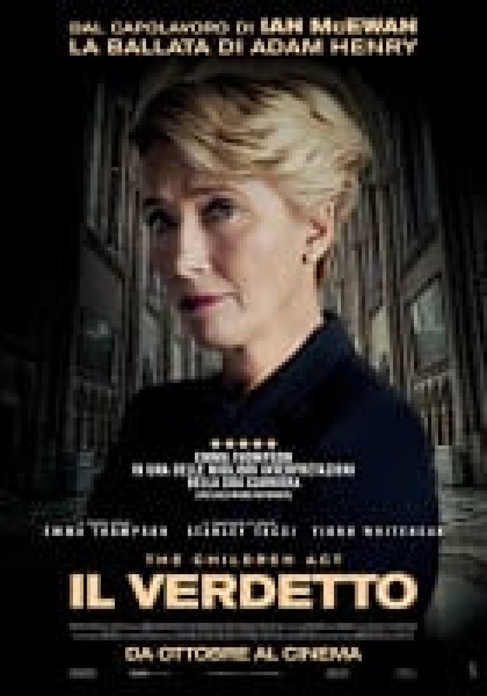 Un romanzo adattato mantenendone intatte le qualità. Non è frequente che accada, specie quando è lo stesso scrittore, non troppo fortunato con i suoi adattamenti al cinema, a prendersi cura della sceneggiatura. Il talento in questione è quello di Ian McEwan con una storia che fonde con giustezza riflessione, ma soprattutto agire, etico con un ritratto dell’amore di coppia fra ultracinquantenni, portandoci in maniera inedita nell’intimità di una giudice, normalmente vista solo sullo scranno, come un simbolo. Magnifica Emma Thompson, ben spalleggiata da Stanley Tucci, con la regia del veterano Richard Eyre che dona eleganza a un film sempre misurato. (Mauro Donzelli – Comingsoon.it)