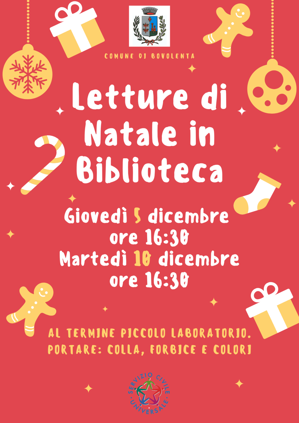 Si informa che giovedì 5 dicembre alle ore 16:30 e mertedì 10 dicembre alle ore 16:30 in Biblioteca Comunale si svolgeranno le letture animate con successivo laboratorio creativo a tema. Per tutti gli interessati si comunica che sarà necessario avere con sé astuccio, colori, forbici e colla.
