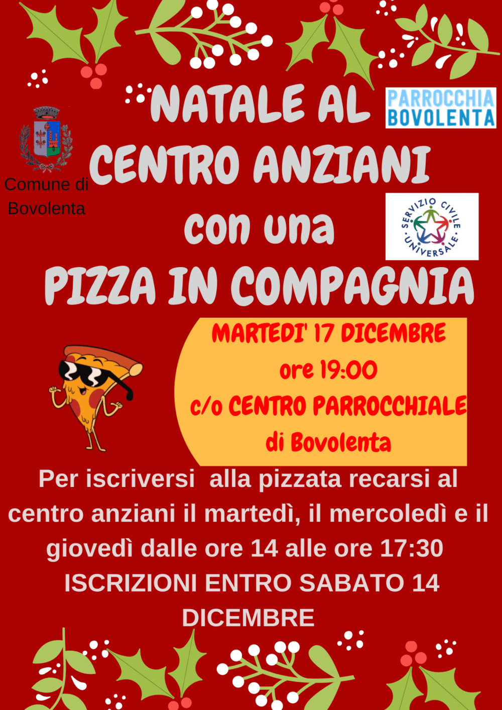 Si informa che martedì 17 dicembre alle ore 19:00 ci sarà la pizzata di Natale per il Centro Anziani presso il Centro Parrocchiale di Bovolenta. Per iscriversi alla pizzata recarsi al centro anziani il martedì, il mercoledì o il giovedì dalle ore 14:00 alle ore 17:30 entro sabato 14 dicembre. In allegato la locandina. Vi aspettiamo numerosi!