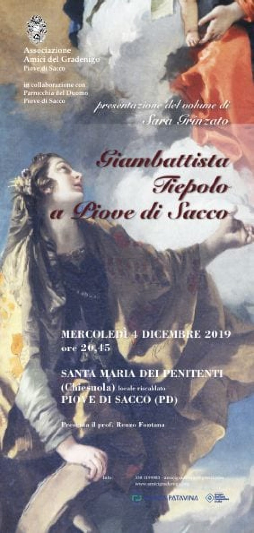 L’Associazione “Amici del Gradenigo” organizza per la serata del 4 dicembre 2019 – ore 20.45 un evento di presentazione del libro scritto dalla storica dell’Arte Sara Grinzato e che riguarda la produzione di Giambattista Tiepolo per Piove di Sacco. Qui ci saranno autentiche sorprese, alcune molto belle ma altre molto amare, quindi vi invitiamo caldamente a presenziare.