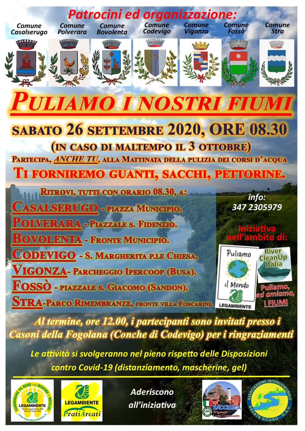 Sabato 26 settembre 2020 ore 8.30 presso il municipio di Bovolenta: iniziativa PULIAMO I NOSTRI FIUMI