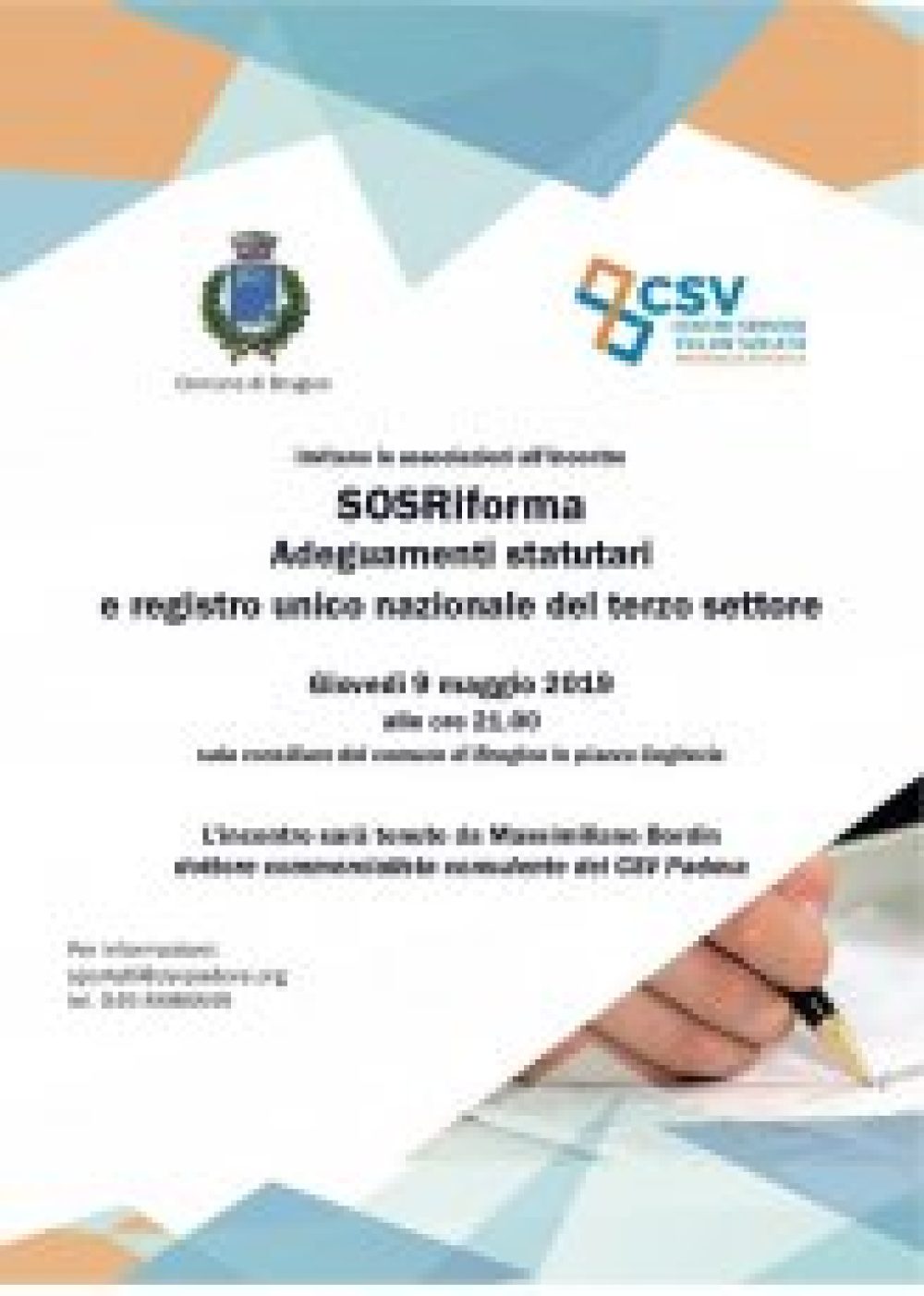 Giovedì 9 Maggio alle ore 21 presso la sala Consiglio del Comune di Brugine incontro sugli adeguamenti statutari.