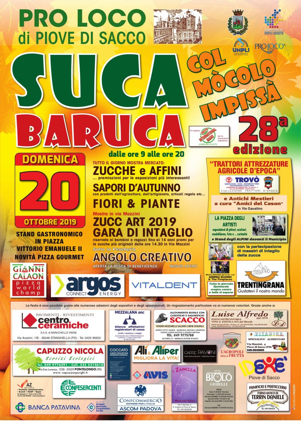 Torna a Piove di Sacco “Suca Baruca col mocolo impissà”, la tradizionale festa della zucca con stand gastronomico che proporrà il celebre risotto di zucca e altri piatti speciali. Nelle vie e nelle piazze del centro storico artigiani, artisti, vivaisti e aziende agricole esporranno i loro prodotti. Non mancherano spettacoli musicali, di giocoleria e rievocazioni storiche dei “mestieri de na volta”. L’intaglio della zucca si svolgerà in Via Mazzini. Saranno premiati i migliori con coppa e riconoscimento delle autorità.