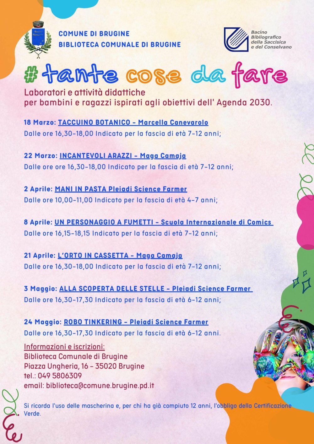 La Biblioteca Comunale in collaborazione con il Bacino Bibliografico Saccisica e Conselvano organizza laboratori ed attività didattiche per bambini e ragazzi ispirati agli obiettivi dell’Agenda 2030.