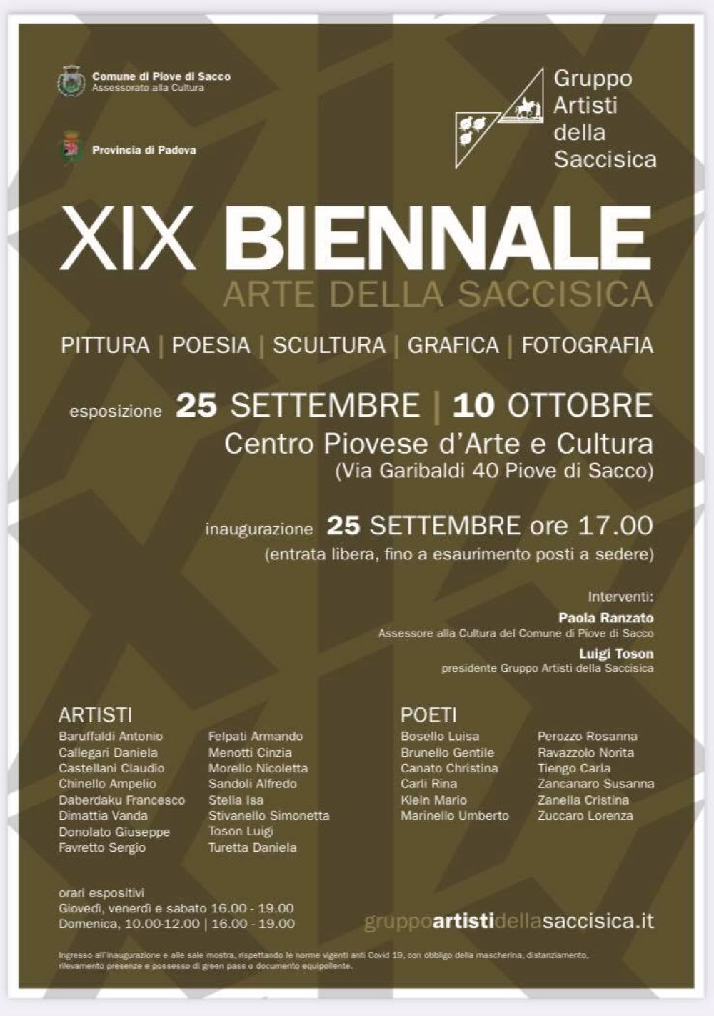 Il Gruppo artisti della Saccisica ha il piacere di invitare la cittadinanza alla 19^ Edizione 2021 della Biennale d’arte della Saccisica.